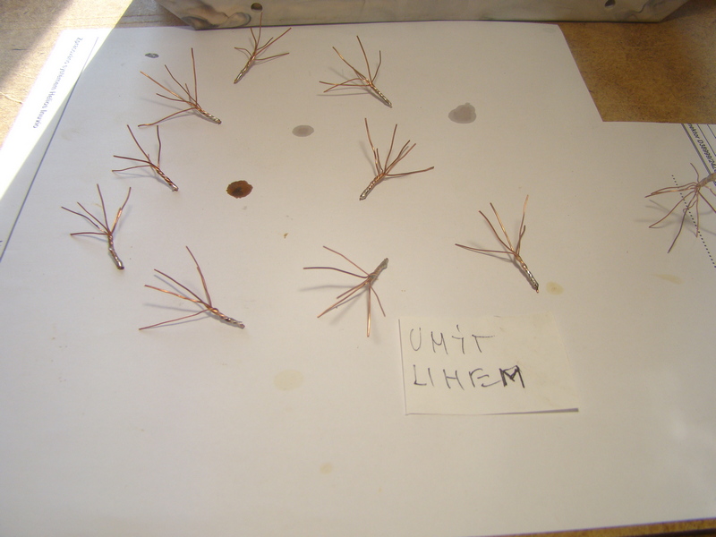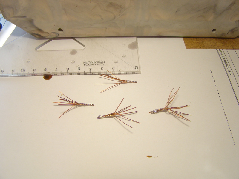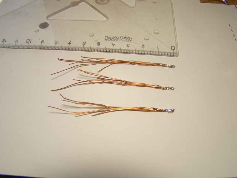 Začátek je spletení několika drátků a sletování konce cínem aby se drátky nerozpletly. Nemá smysl jich motat moc, stačí 6-8 třeba. Drátky to chce trochu silnější než je z vodiče například průřezu 2,5mm. Ty jednotlivé vlákna mají na průměr tak 0,3-0,5mm. Jsou z nějakého silného vodiče.