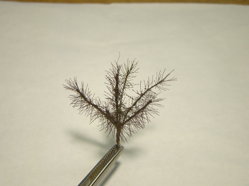 Následovalo ponoření horní části keře do duvilaxu (herkulesu) a setření přebytečného lepidla štětcem zpět do sklenice. Drátky jsem držel za spodek pinzetou a proste namočil do sklenice jen přibližně větve ať si nezakydám pinzetu od lepidla. Následně jsem naflokoval do lepidla flok délky 4-5mm. Barva je asi jedno, bude se přestříkávat.