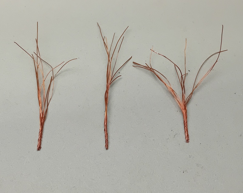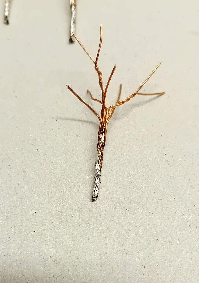 Jako obvykle je základem měděný drát nebo v tomto případě spíše zbytky drátu z výroby stromků. Na jeden nálet tak 10-15 drátků, víc nemá smysl. Délka 5-8cm.