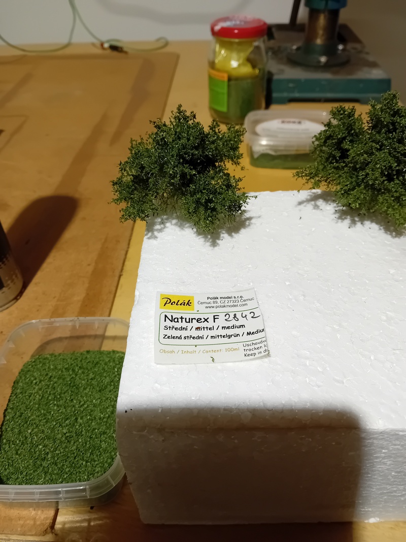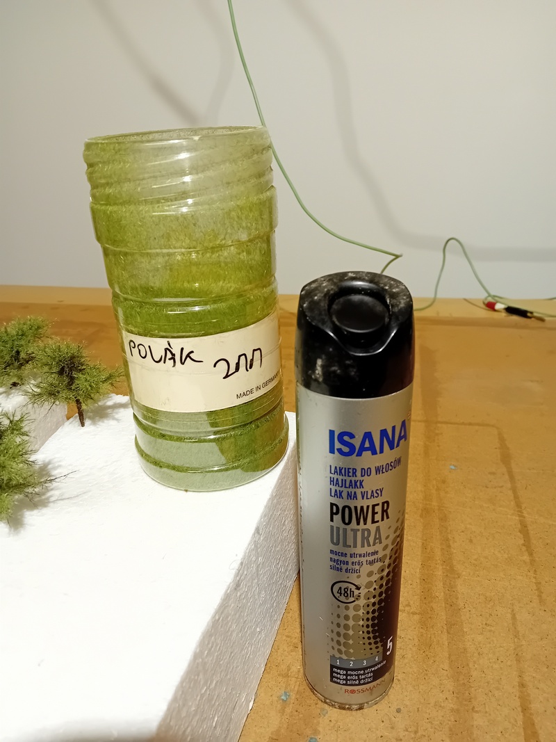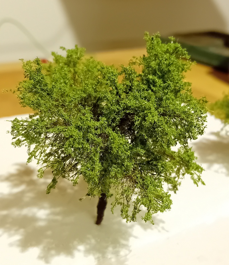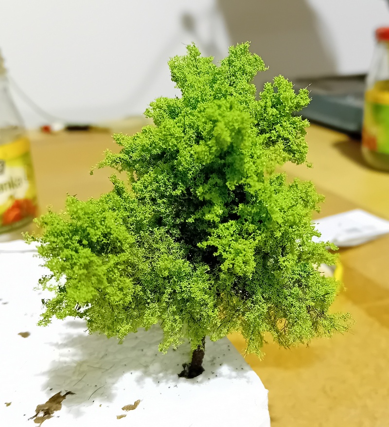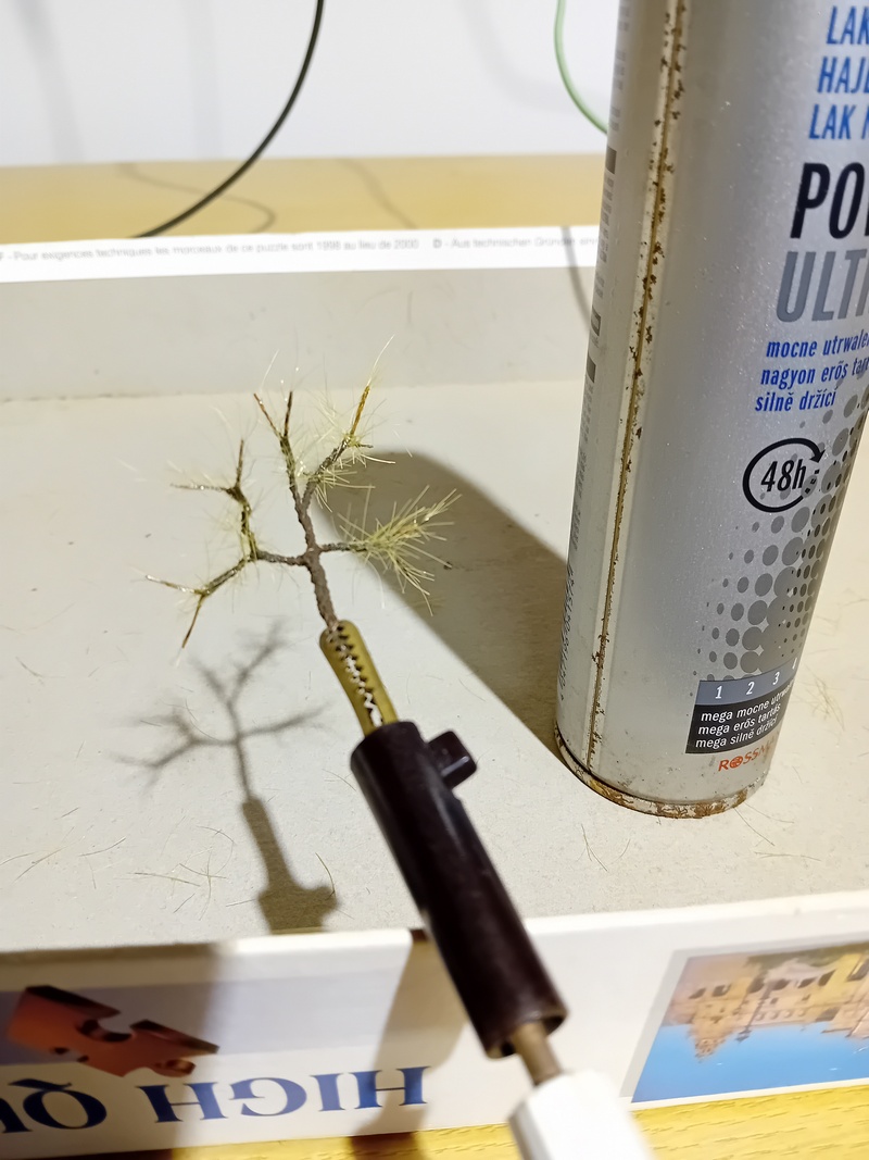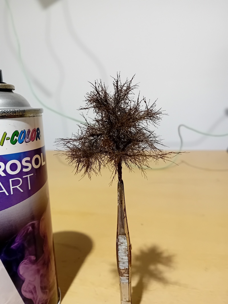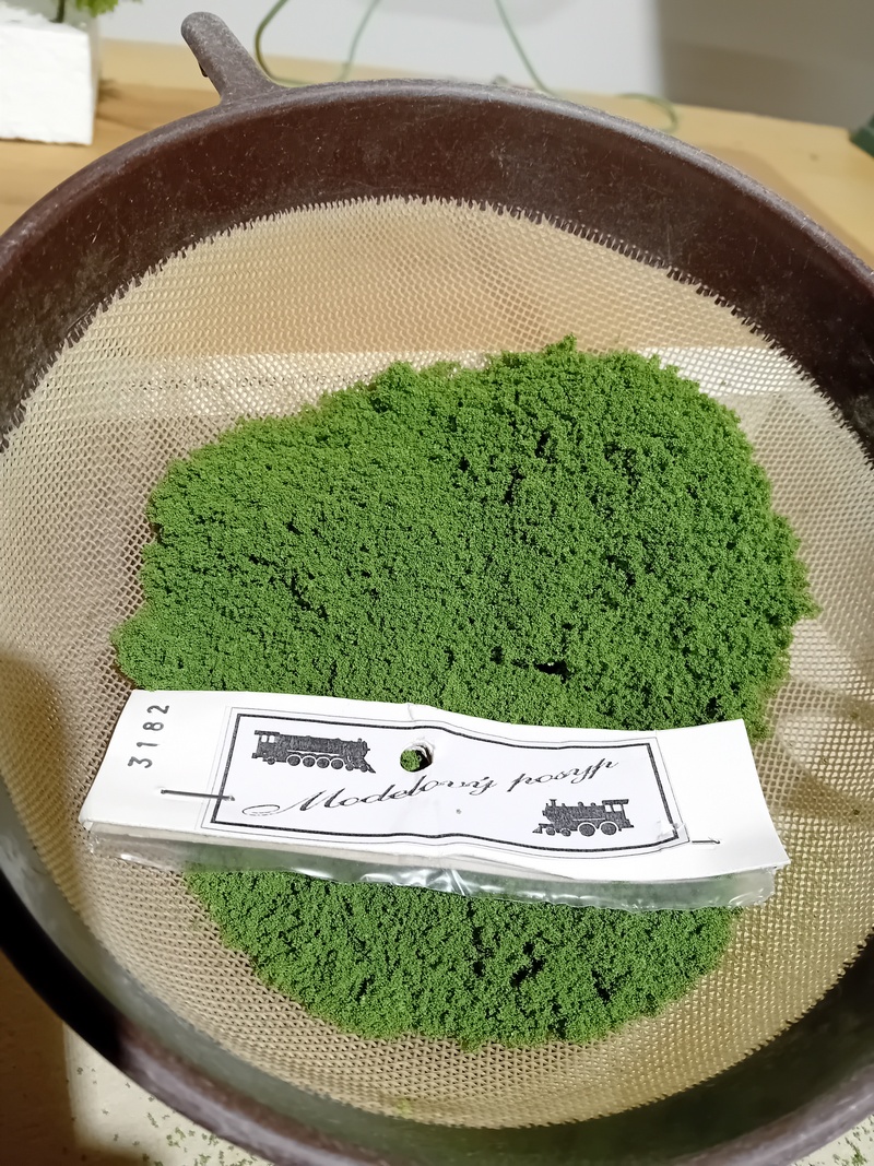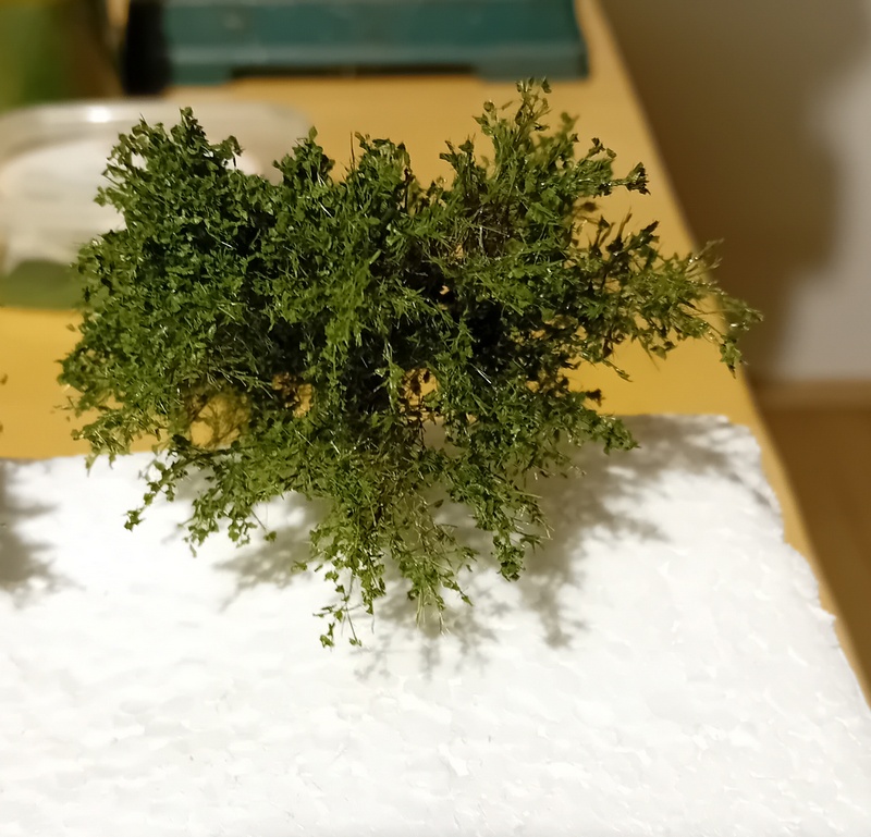 Po zaschnutí jsem postříkal větve silně tužícím lakem na vlasy a flokoval 4mm trávou. Odstín neřešit, bude se přestříkávat. Opět bych té trávy nevalil moc aby to pak nebyl chomáč čehosi.