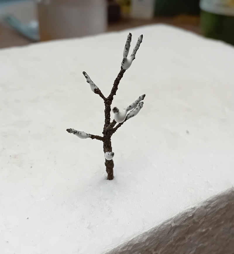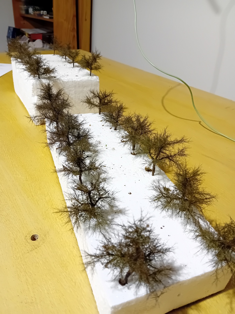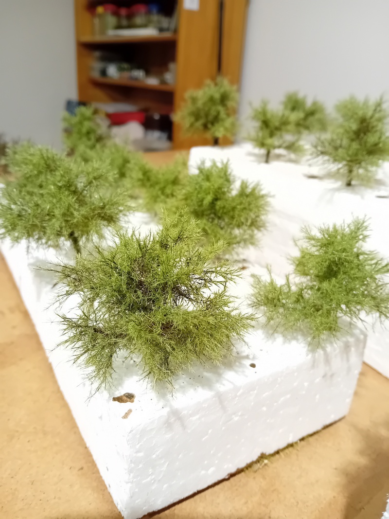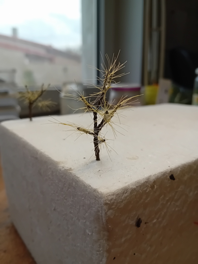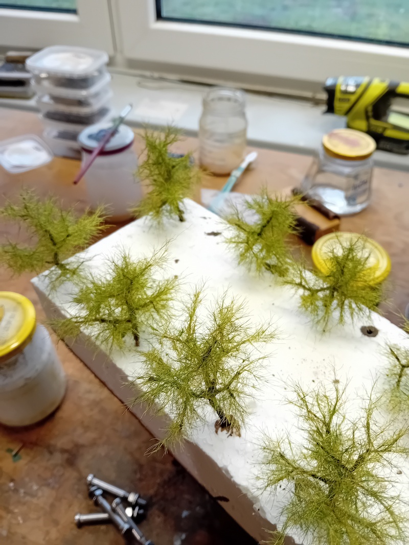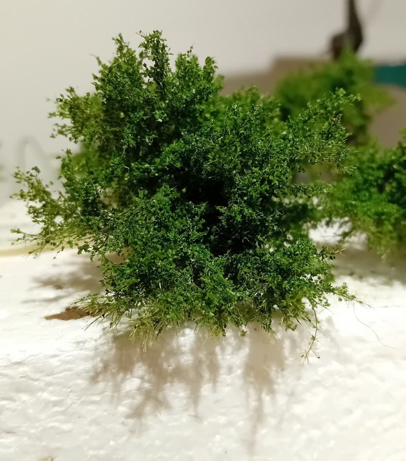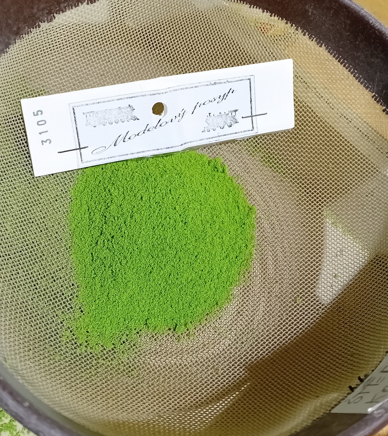 Po zaschnutí jsem postříkal větve silně tužícím lakem na vlasy a flokoval 4mm trávou. Odstín neřešit, bude se přestříkávat. Opět bych té trávy nevalil moc aby to pak nebyl chomáč čehosi.