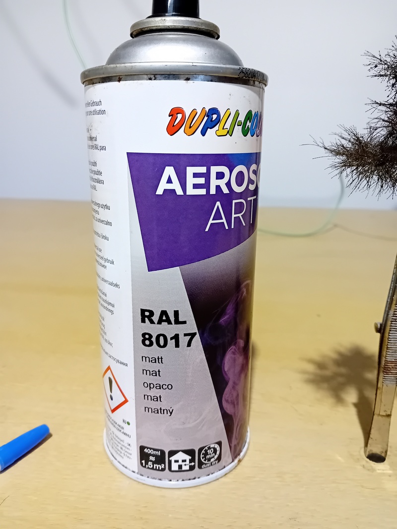 Chytit nálet do samodržící pinzety a zastříkat hnědým sprejem. Jak je vidět, nemá smysl dělat jeden nálet ale větší množství. Není to tak pracné, tak to jde dost rychle i při větším množství.