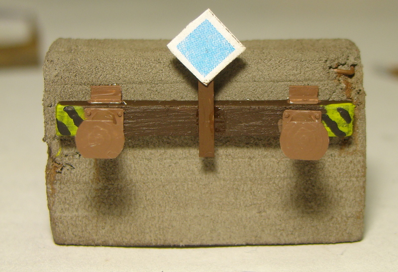 Tady jsem se snažil naznačit mastnotu na styčných plochách nárazníků a nějakou patinu. Na styroduru akryl, na nárazníkách a pražci syntetika.