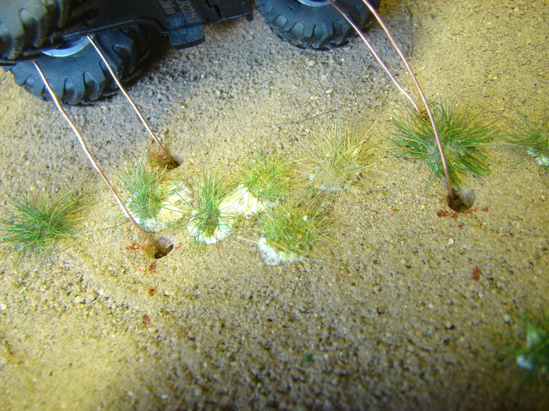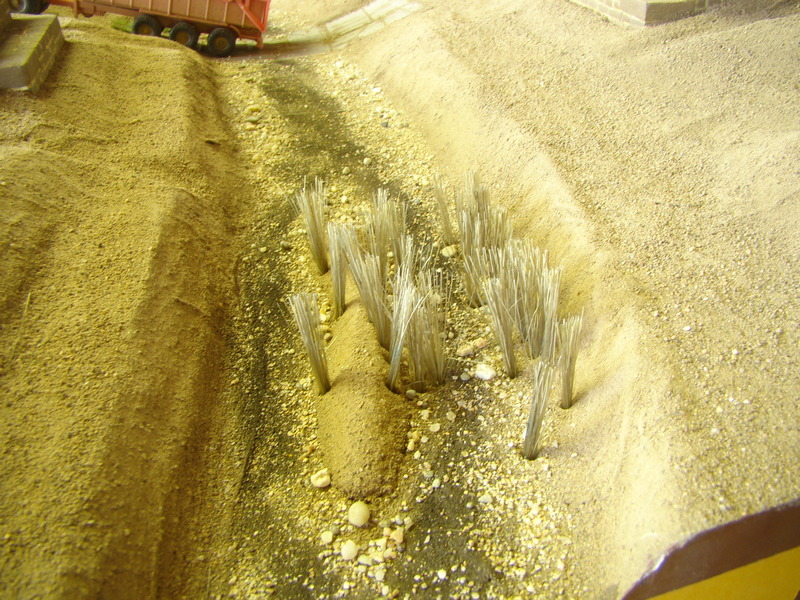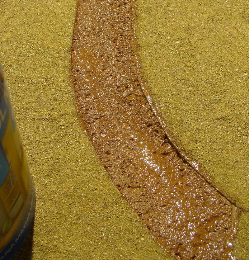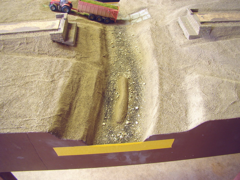 V některých místách kde byla asi velká vrstva nebo spoj mezi vyřezaným ubrouskem a novou hlínou se udělali praskliny. Některé byli dost velké tak jsem je zasypal mírnou vrstvou hlíny a postříkal ředěným sportakrylem mat a opět rozjezdil podvozkem.