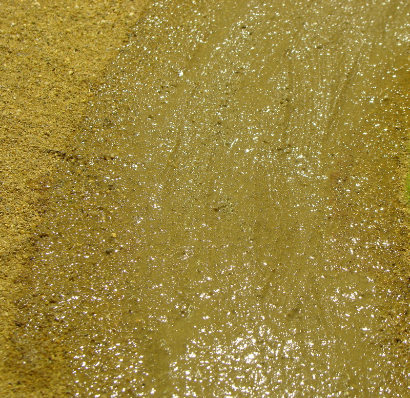 Namíchal vodu. Ano, je to moc tmavé. Dělal jsem před tím vzorek. Kamarádům se to zdálo moc světlé, tak jsem přidal křídy. No, asi moc.... Zřejmě zapršelo a tak teče i hlína....