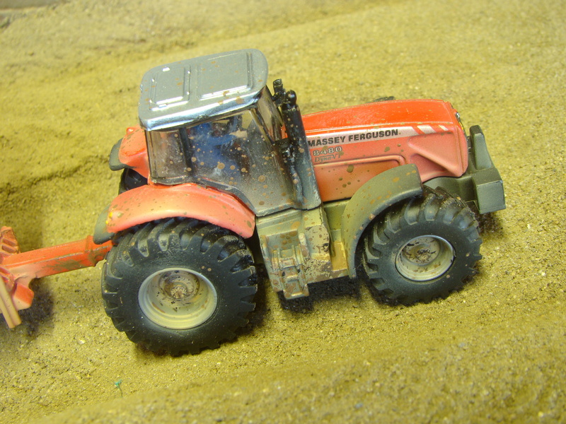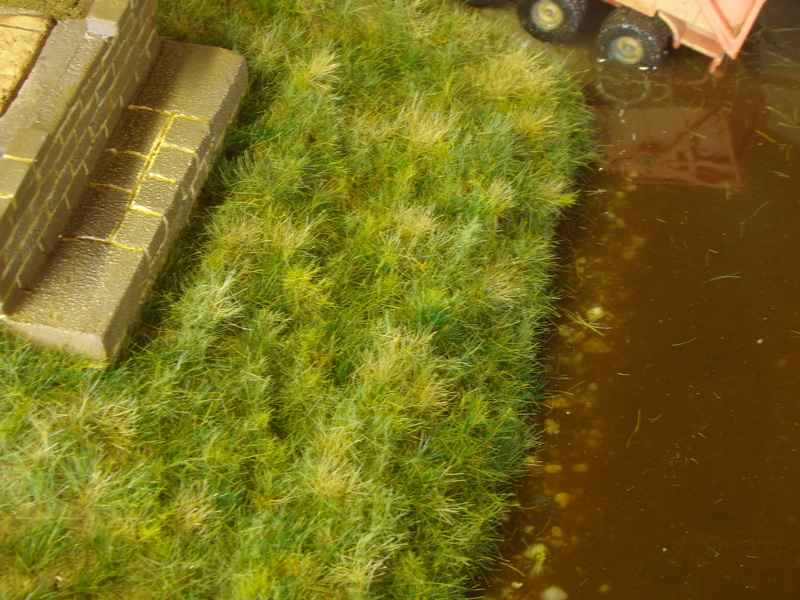 Naflokované drny na plast a následně nalepené do kapek lepidla. Traktor jsem fixoval přes osky tenkým drátem ať mě neupadne při převážení.