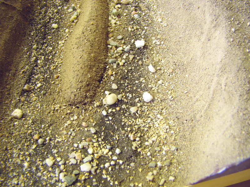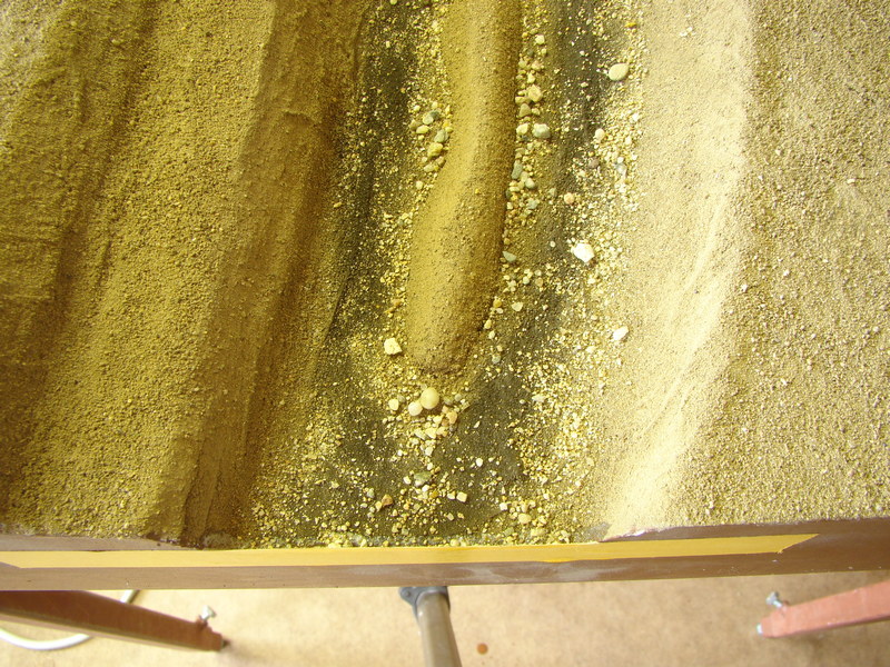 Následovalo olepení hran kde bude řeka lepící igelitovou stavební páskou, vysypání dna kamínky a ušpinění nastrouhanýma křídama. Kolem lepící pásky jsem ještě dle rady pro jistotu nakapal duvilax aby mě modelová voda neprotekla.