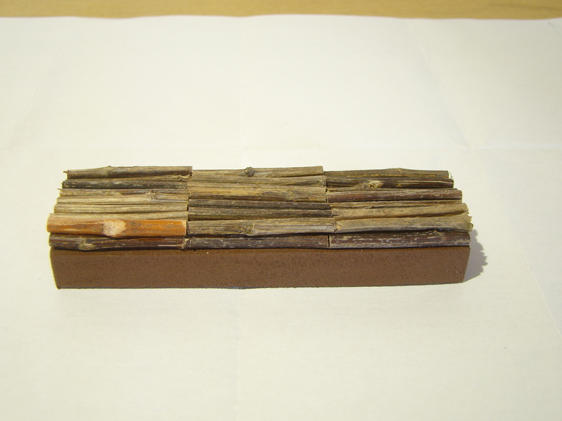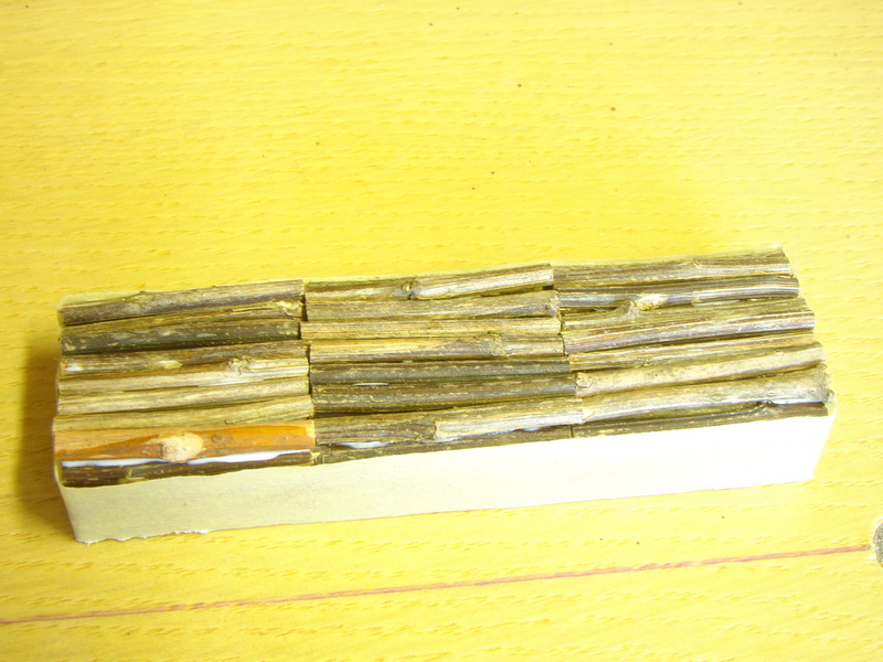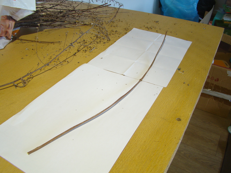 Je potřeba si dopředu nachystat materiál který by kulatinu imitoval. Není úplně jednoduché najít vhodný neboť třeba větvičky stromů pokud jsou tenké, tak mají blízko sebe pupeny a to by nevypadalo dobře. Nakonec jsem našel více méně dva vhodné kandidáty, které jsem si nastříhal a snad rok doma sušil.